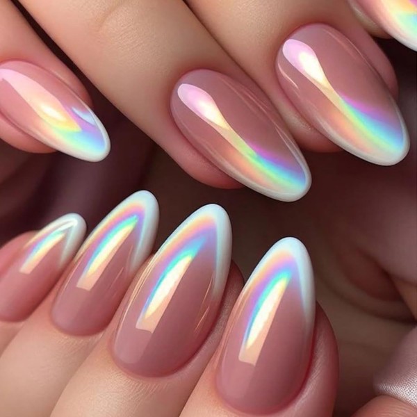 Pink Press on Nails Almond Laser Fake Nails Medium Gradient False Nails with Designs Acrylic Nails Spring Summer Glue on Nails Glossy Medium Artificial Nails Stick on Nails for Women