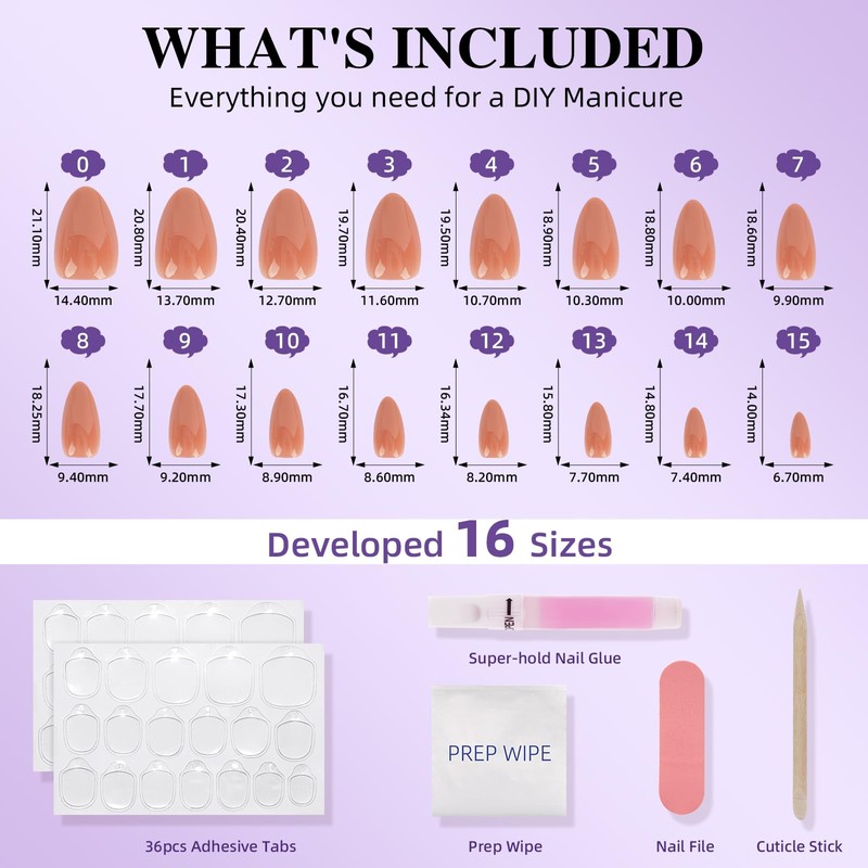 Each set includes 32 press-on nails in 16 precisely sized options for a perfect, natural-looking fit—no trimming or shaping needed.