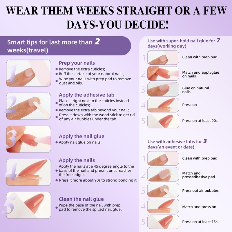 Designed for multiple wears with proper care. Strong adhesive, easy removal, and no damage to your natural nails.