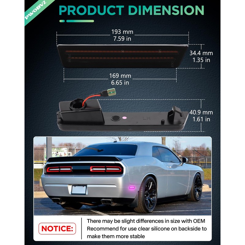 - EASY TO INSTALLl: Plug and play, directly replace challenger rear bumper side marker lights; Since there are slight dimensional differences between modified and OEM parts, we are highly recommend you to use 3m weatherstrip & clear silicone to put on the backside to avoid rattle