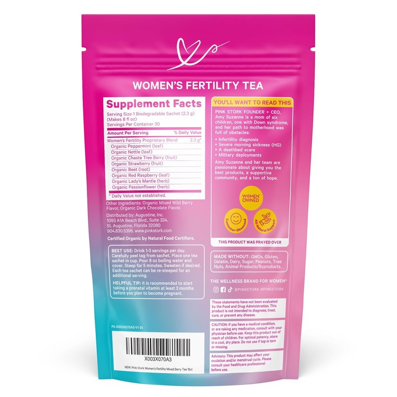 • Struggling to conceive? You're not alone—1 in 6 couples face fertility challenges. Pink Stork Fertility Tea is crafted with seven USDA organic herbs, including Chaste Tree Berry (Vitex), Red Raspberry Leaf, Lady’s Mantle, and Stinging Nettle, traditionally used to support hormone balance, regular cycles, and reproductive wellness.