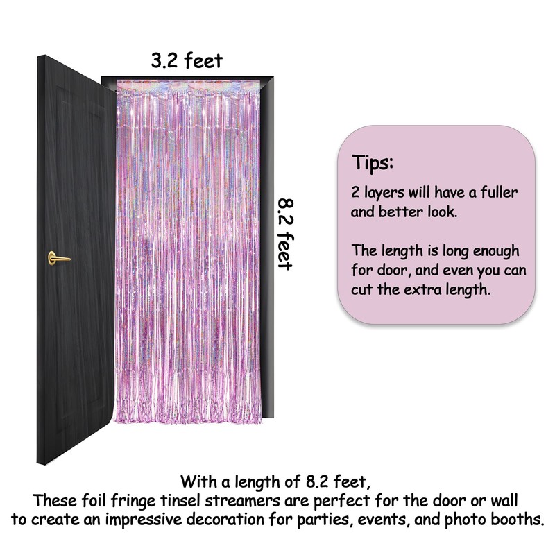 - Featuring a playful pink color and shimmering foil material, this fringe curtain adds a festive touch to any party or celebration, particularly those with themes such as unicorn, princess, and kitty, or events like a "happy boo day" celebration.