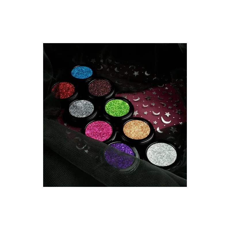 Glitter compacto con alta pigmentación, fórmula que evita que se volaticen los glitters o se esparzan por la piel del rostro.