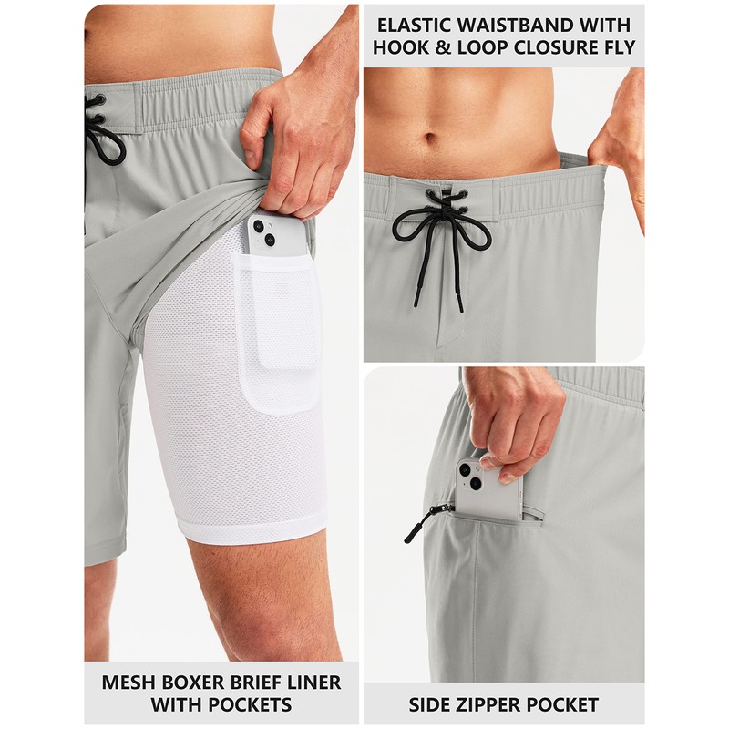 Pinkbomb Men's Swim Trunks with Compression Liner 9 Inch Quick Dry Swimsuit Swimming Swim Board Shorts for Men with Pockets, Bright Grey, X-Large