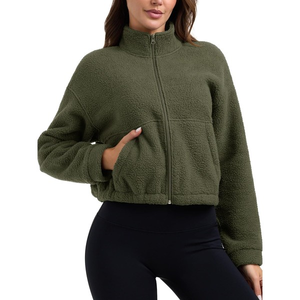 PINKMSTYLE Womens Zip Up Fleece Sherpa Jacket Coat Sweater Warm Trendy Cropped Sweatshirt Workout Top Army Green Large