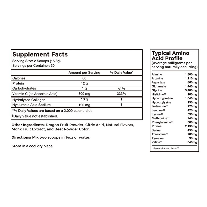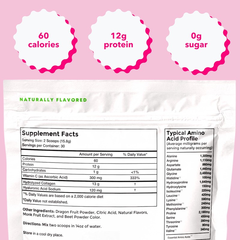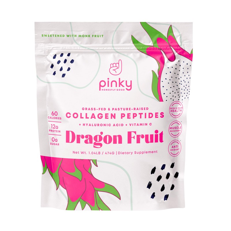 Pinky Collagen Peptides with Hyaluronic Acid & Vitamin C - Dragon Fruit Flavor (1lb/474g), Supports Skin, Hair, and Gut Health, 13g Hydrolyzed Collagen, Zero Sugar, High in Protein, Naturally Flavored