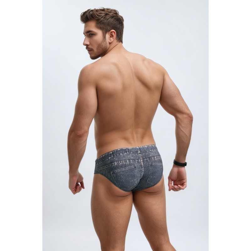 PINKY SENSON Swim Briefs Men's Faux Jeans Print Quick-Dry Beachwear Adjustable Drawstring Surf Board Shorts for Water Sports Light Black XXL
