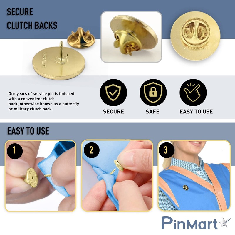 - SECURE CLUTCH BACKS: Our years of service pin is finished with a convenient clutch back, otherwise known as a butterfly or military clutch back, it is the most versatile and popular attachment; fastens securely to any garment, bag, hat, or lanyard and includes an anti-spin spur for added security