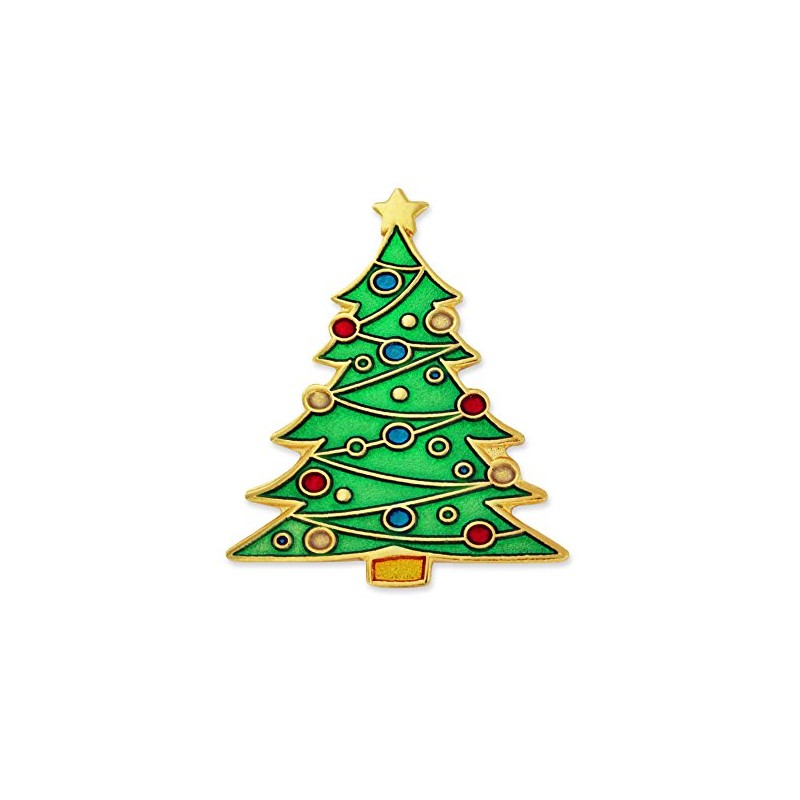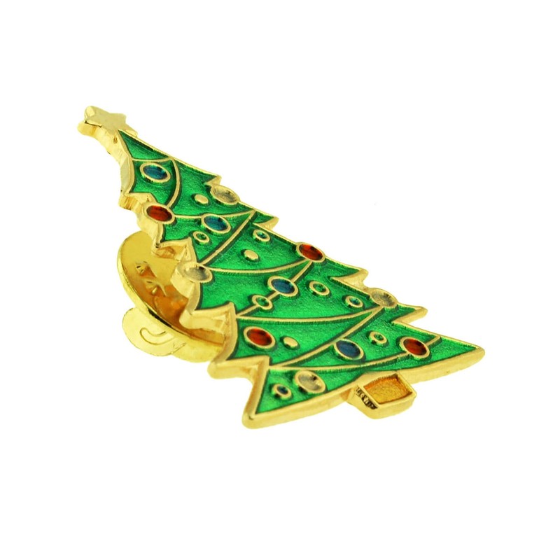 - This fun Christmas Tree lapel pin is die struck from jeweler's metal, gold plated and hand filled with many brilliant transparent enamel colors. This current day design is a traditional hit; perfect for party favors, stocking stuffers and "quick gifts" for friends and colleagues.