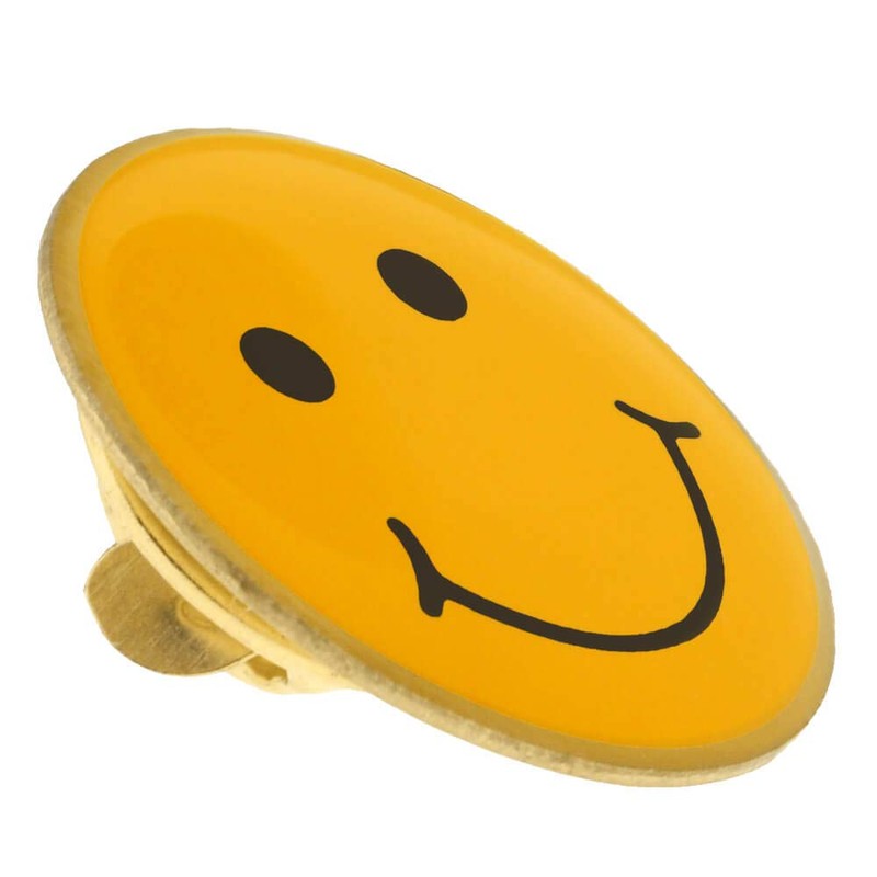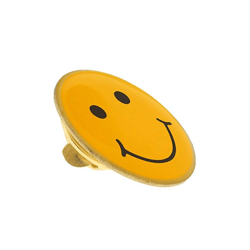 - Our Smiley Face Lapel Pin features black and yellow enamel, gold plating, and includes an epoxy varnish to protect the surface.