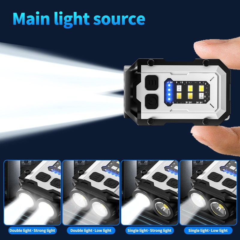 - Mini linterna LED superbrillante: la lámpara mide solo 2.3 pulgadas de largo y pesa solo 16 onzas. Es del mismo tamaño que un encendedor, pero puede proporcionar una gran luz. El haz alcanza fácilmente los 50 metros máximo. La luz tiene 4 modos: doble luz fuerte/débil o una sola luz fuerte/débil. La luz lateral COB tiene 3 modos: blanco/rojo/sos. En el modo sos, habrá luz roja y luz azul parpadeando, te mantendrá siempre seguro en cualquier situación de emergencia.