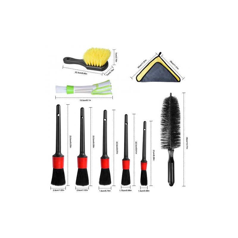 - 9-in-1-Auto-Radbürsten-Set: Dieses 9-teilige Pinsel-Set enthält 5 verschiedene Detail-Pinsel, 1 lange Griff-Radbürste, 1 kurze Reifenbürste, Klimaanlagen-Entlüftungsbürste und 1 Reinigungstuch. Verschiedene Bürsten können verschiedene Teile des Autos effektiv waschen. Dieses Bürsten-Set kann alle Ihre täglichen Autoreinigungsbedürfnisse erfüllen.