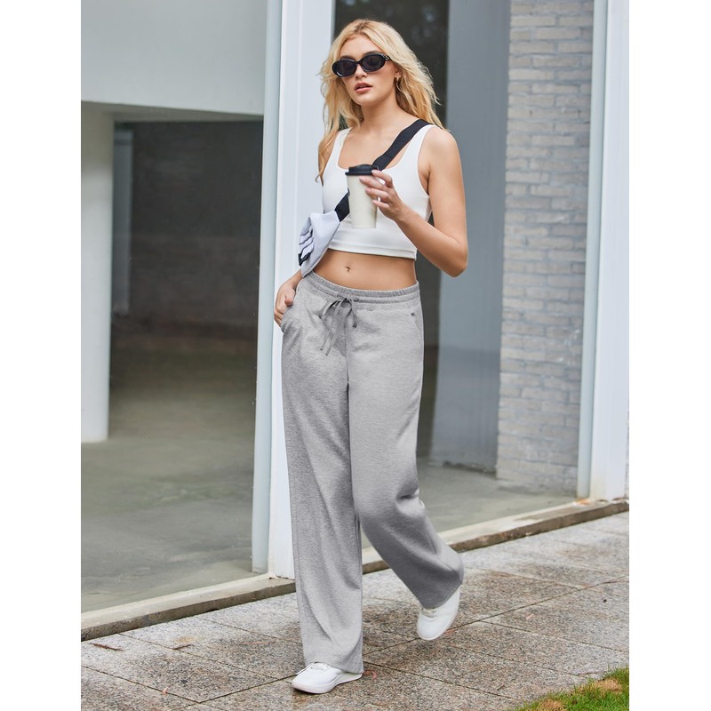 PINSPARK Womens Wide Leg Sweatpants High Waisted Baggy Loose Sweat Pants Comfy Drawstring Workout Pants with 2 Pockets Light Gray S