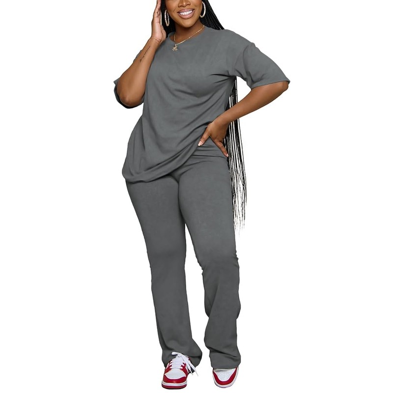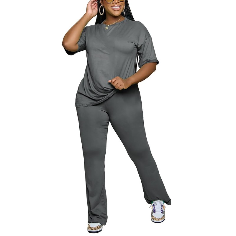 PINSV Womens Sets 2 Piece Outfits Casual Short Sleeve Top and Flare Pants Lounge Sets Tracksuit Grey XL