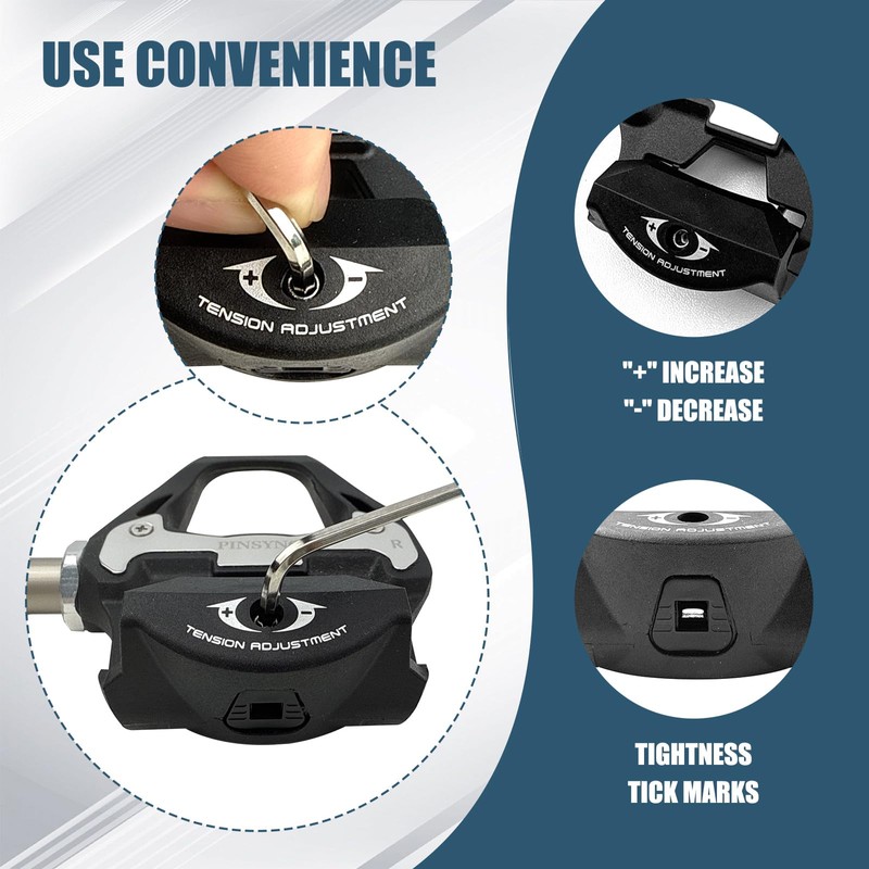 - Easy Clip In/Out: The tension of clipless pedals can be adjusted according to different personal preference. Use the included 2.5mm allen key to efficiently adjust tension: "-"indicateseasier release and "+" higherresistance, with reference scales on the pedal. Adjust based on your riding needs