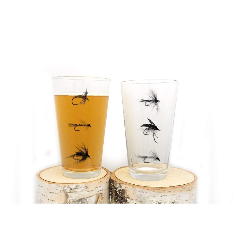 Pint Glasses by Black Lantern – Handmade Craft Beer Glasses and Bar Glassware – Fly Fishing Flies Design (Set of Two 16oz. Glasses)