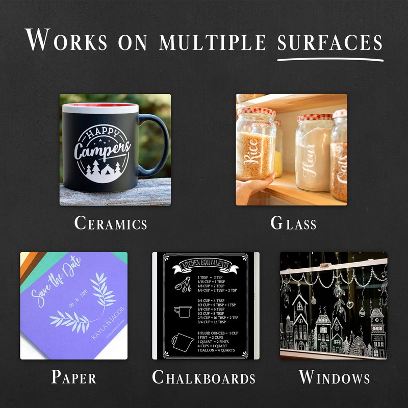 - Sofort abwischbar - Sie können Ihre Kreationen auf nicht porösen Oberflächen (wie Fenster, Glas, Tafelkreide oder Kreidetafeln) in Sekundenschnelle mit einem feuchten Tuch abwischen, ohne Flecken oder Rückstände zu hinterlassen! Auf porösen Oberflächen wie Holz ist die Tinte permanent.
