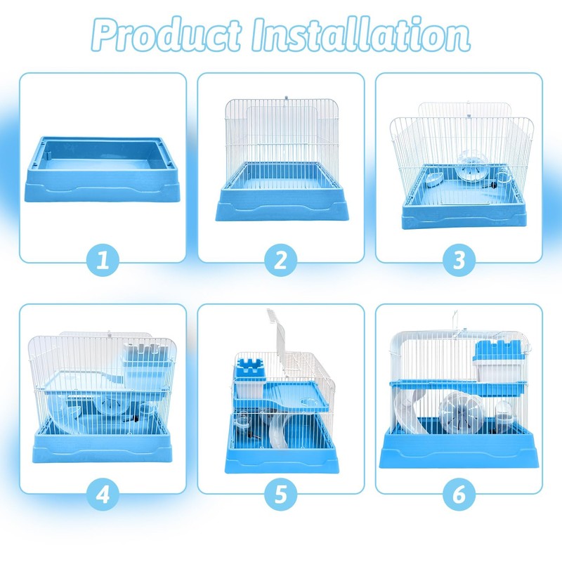 - Hamster Cage:Set includes mice cage*1, castle house*1, 2nd floor platform*1, slide*1, running wheel*1, water bottle*1, food bowl*1. The hamster cage has a sturdy structure, which allows you to ventilate the cage and see your pet's activities
