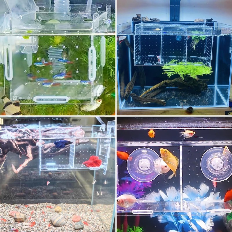 - Multi-functional Design: Our aquarium breeding tank comes with a separate isolation panel that reduces the risk of fish attack and protects injured fish or small fish. The suction cups are sturdy and stable and will not slip off. Top feeding hole eliminates the need to open the lid to feed materials