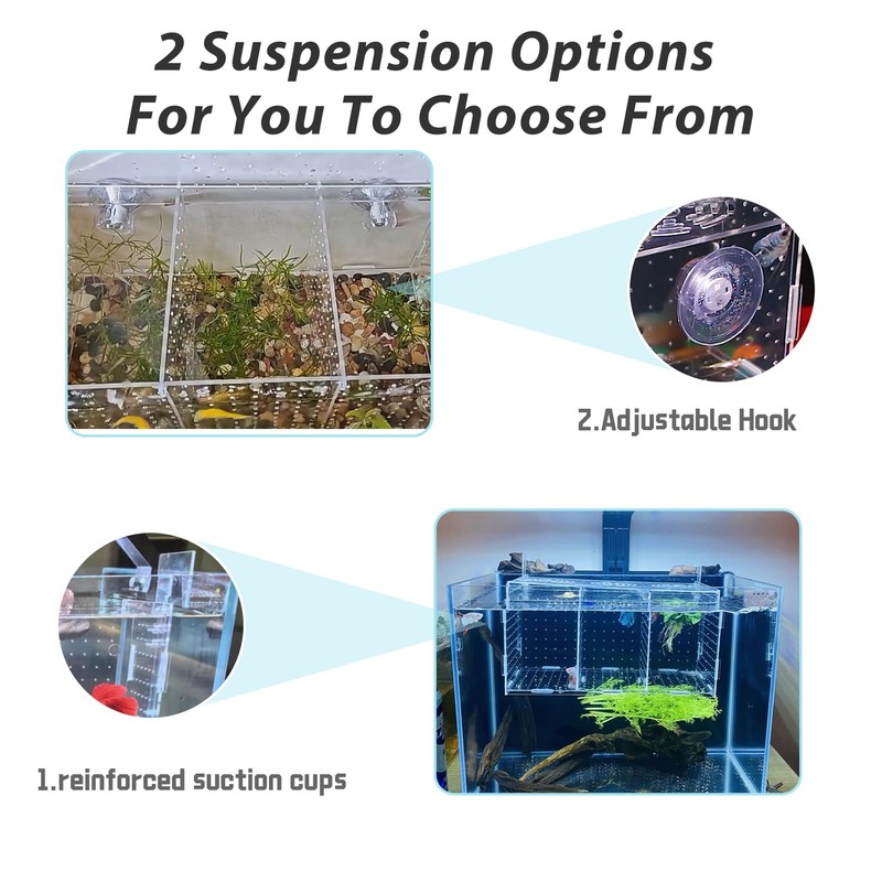 - Hassle-free Installation and Adjustable Height: Install according to the installation diagram on the picture, you can harvest a breeder box for fish tank in 3 minutes.In addition, there are two types of hanging methods, and the height of the hook can be adjusted, ensuring convenience and flexibility to meet your fish farming needs