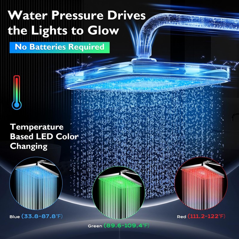 - LED Rainfall Shower Head: Transform your vertical showering experience with our LED rainfall shower head that changes colors based on water temperature without batteries for a unique shower sensation. Enjoy refreshing blue cold water under 87.8℉, pleasant green warm water between 89.6-109.4℉, and be cautious of burns for red hot water between 111.2°F-122℉or above.