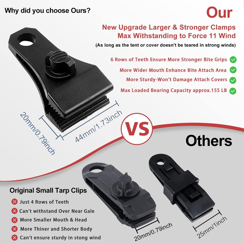 - ✔️【Clips de lona】: las abrazaderas de lona de alta resistencia son ideales para sostener lonas, toldo, cubierta de barco, lluvia, cubierta de bicicleta, cubierta de coche/camión, cubierta de piscina, cubiertas de toldo de camping, refugios temporales, clips de amarre de lona, etc.