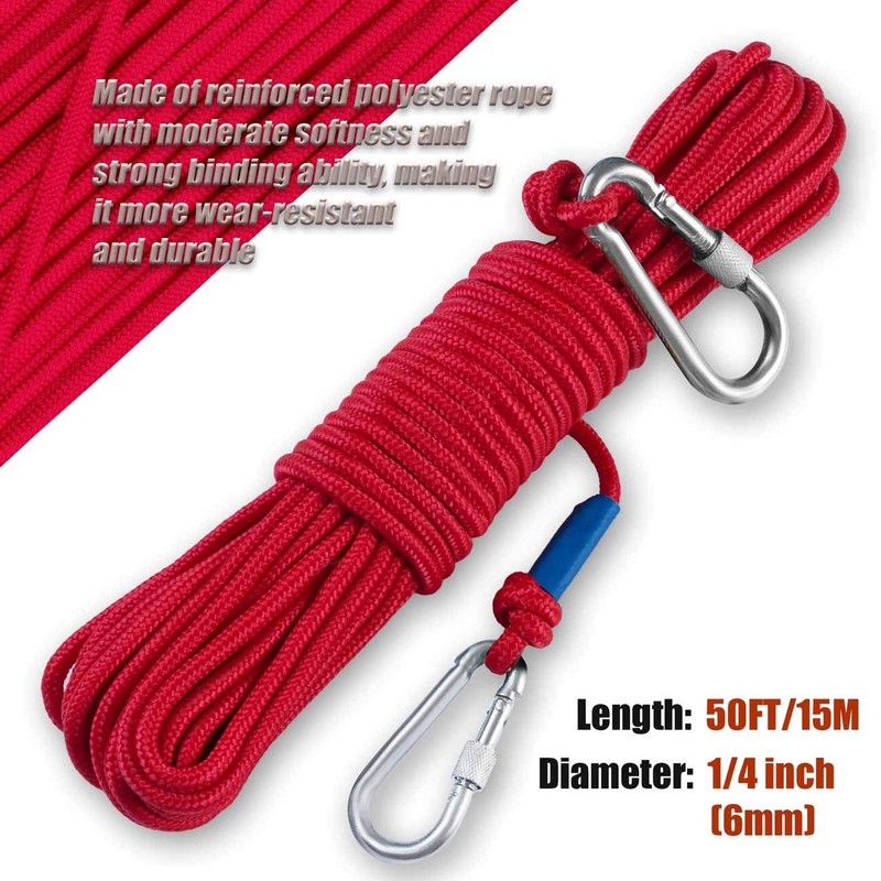 - The three sizes of grapple hook come with a nylon rope that matches their weight rating, so you can start using it right away. The ropes are 50FT in length and 1/4 inch, 1/3 inch, and 2/5 inch in diameter. We also provide two steel carabiner for each rope, so they can be easily used independently if necessary