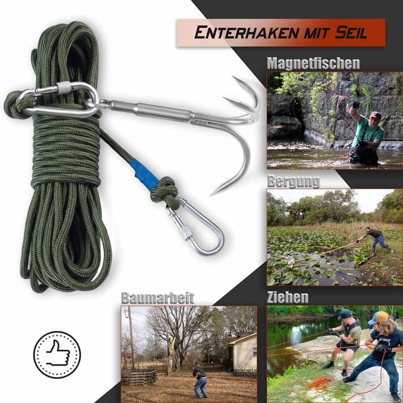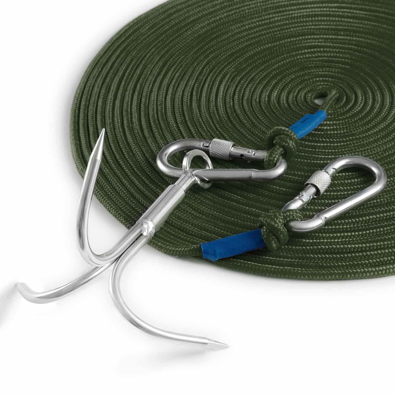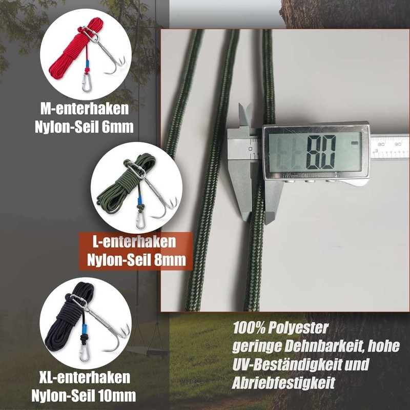 - The three sizes of grappling hooks come with a nylon rope that corresponds to the respective weight classes, so you can get started right away. The ropes are 15 m long and have a diameter of 6/8/10 mm. Each rope is equipped with two carabiners that allow easy and independent use if necessary