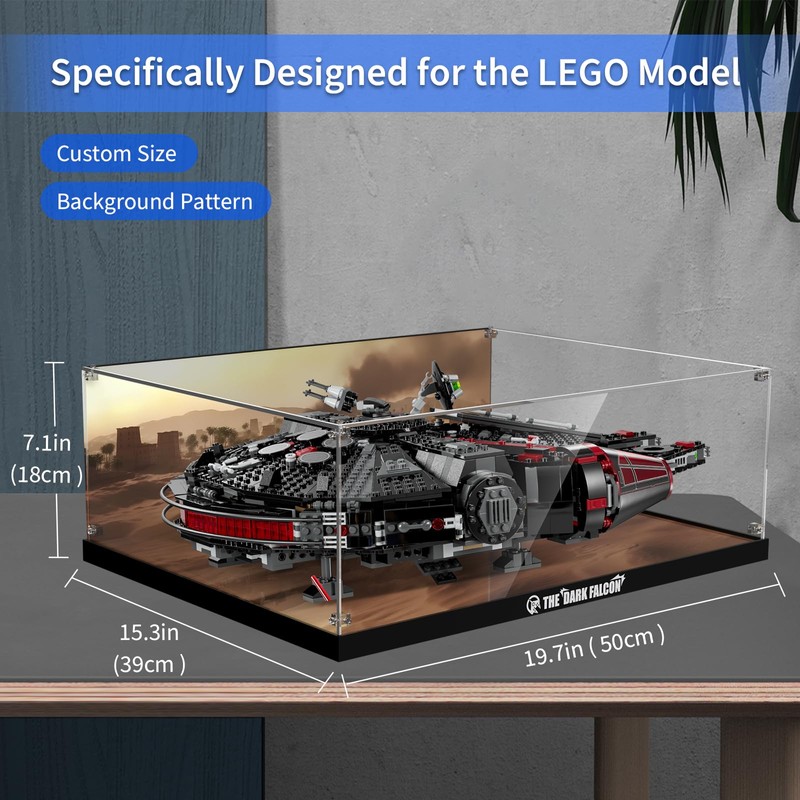 • 【Designed for 75389】 This acrylic display case is specially designed for 75389 The Dark Falcon. Please note that this case does not have enough height to accommodate the model with its display stand. But you can put the model with its racing stand in the case.