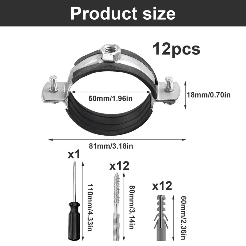 Pipe Clamp Set 50 mm: 12 Screw Pipe Clamps + 12 Dowels + 12 Hanger Bolts, Pipe Holder with Screwdriver, Screw Pipe Clamps with Rubber Insert for Ht Pipe, Water Pipe, Ventilation Ducts