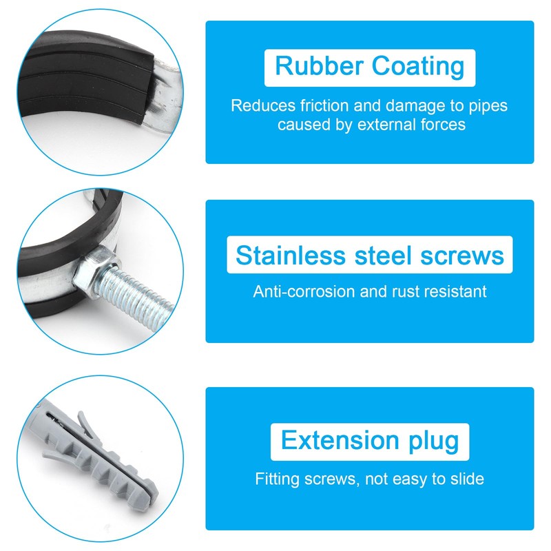 - Wide range of applications: pipe clamp 50 mm can be conveniently mounted on the wall or ceiling, compatible with a variety of occasions to ensure that the installation process is simple and efficient. Clamps are suitable for PVC plastic pipes, steel pipes etc. As well as for gas, water and heating systems in homes, residential areas, public facilities and businesses