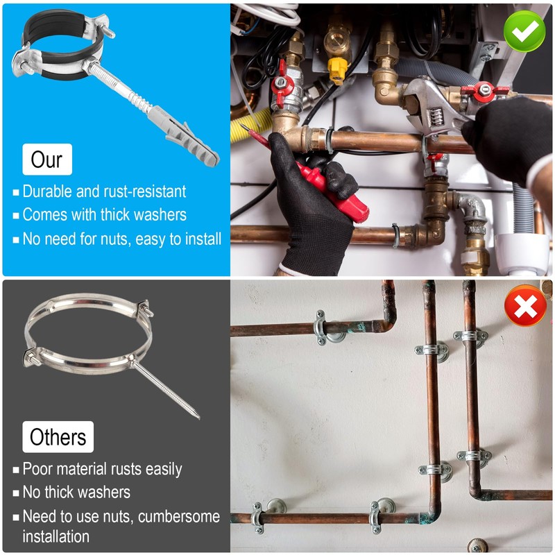 - Product kits: a total of 12 sets of pipe clamp set, including 12 clamps, 12 hanger screws, 12 dowels and a pair of work gloves, fully configured to save time and allow easy and convenient installation