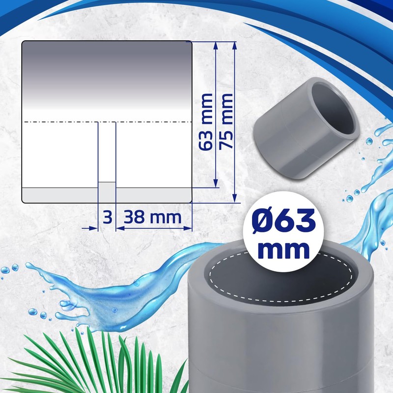 - The pvc coupling has an inside diameter of 63 mm. It is important to ensure that the diameter of the coupling corresponds to the diameter of the plastic pipe to which it will be attached, for a correct and secure fit.
