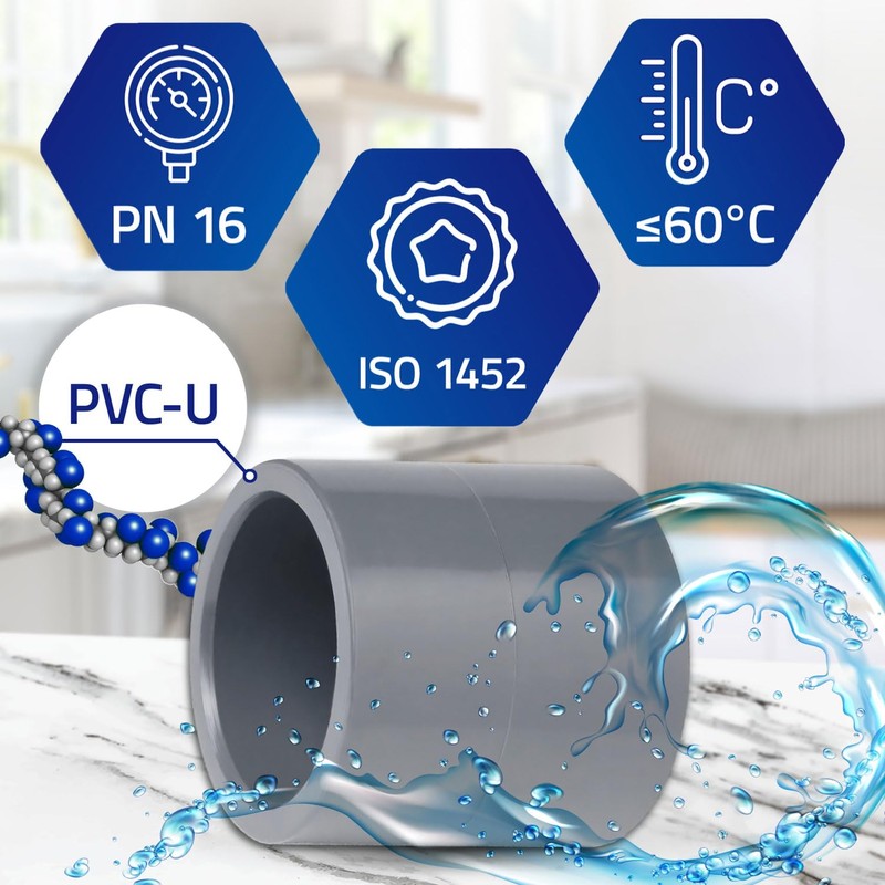 - The pipe connectors PVC U is developed for a wide range of applications including water supply systems, irrigation, water treatment plants, industrial processes and much more, offering versatile solutions for a variety of needs.