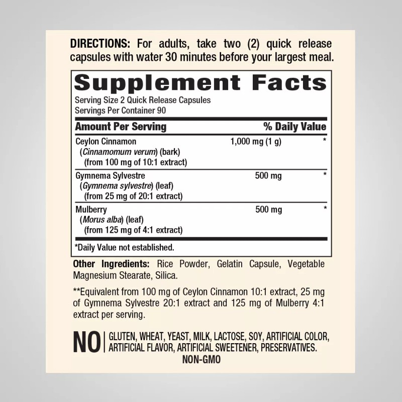 - Ingredients: Ceylon Cinnamon, Gymnema sylvestre, Mulberry