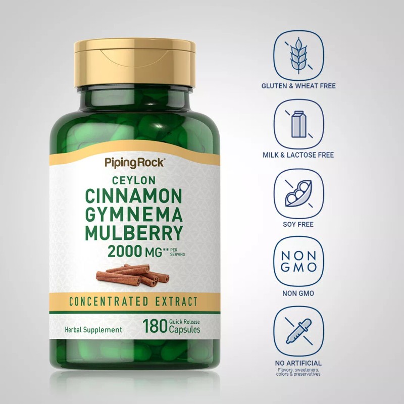 Piping Rock Ceylon Cinnamon Gymnema Mulberry Complex is available in easy-to-swallow quick-release capsules for optimal absorption. Our premium concentrated supplement provides the whole equivalent of 2000 mg of these herbs per serving.