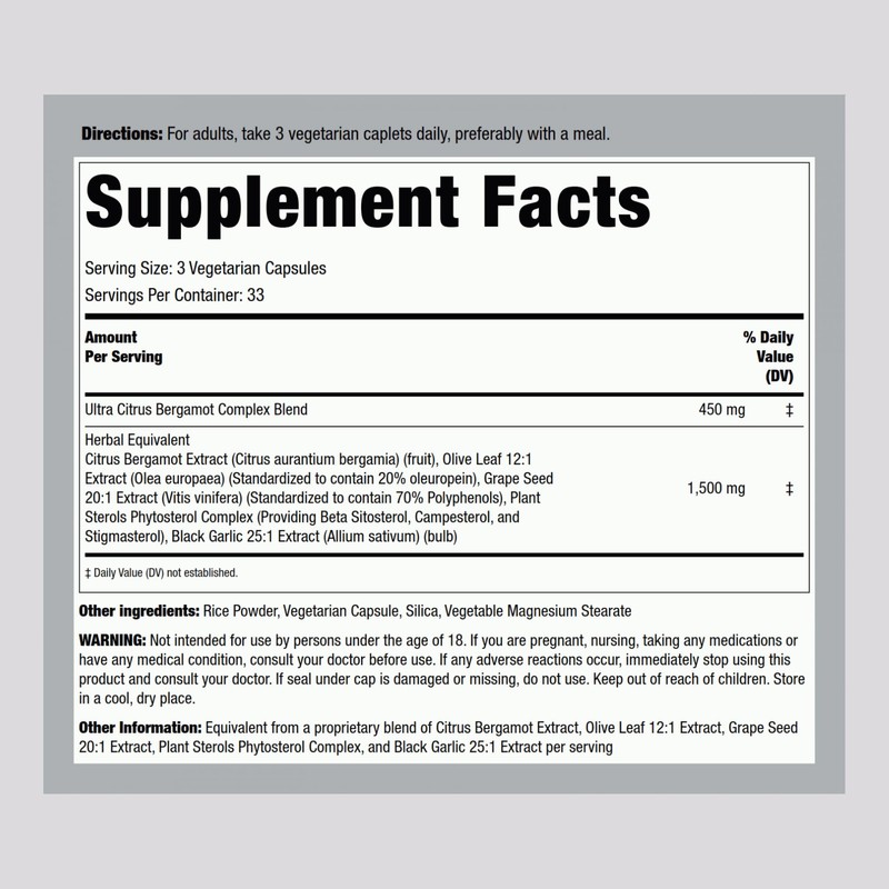 Experience Piping Rock's Ultra Citrus Bergamot Complex Blend! Vegetarian capsules feature a unique blend of ingredients including Citrus Bergamot, Olive Leaf, Grape Seed, and Black Garlic Extract, plus a Plant Sterols Phytosterol Complex. Our formula is gluten free and non-GMO, making it a top choice for men and women everywhere.