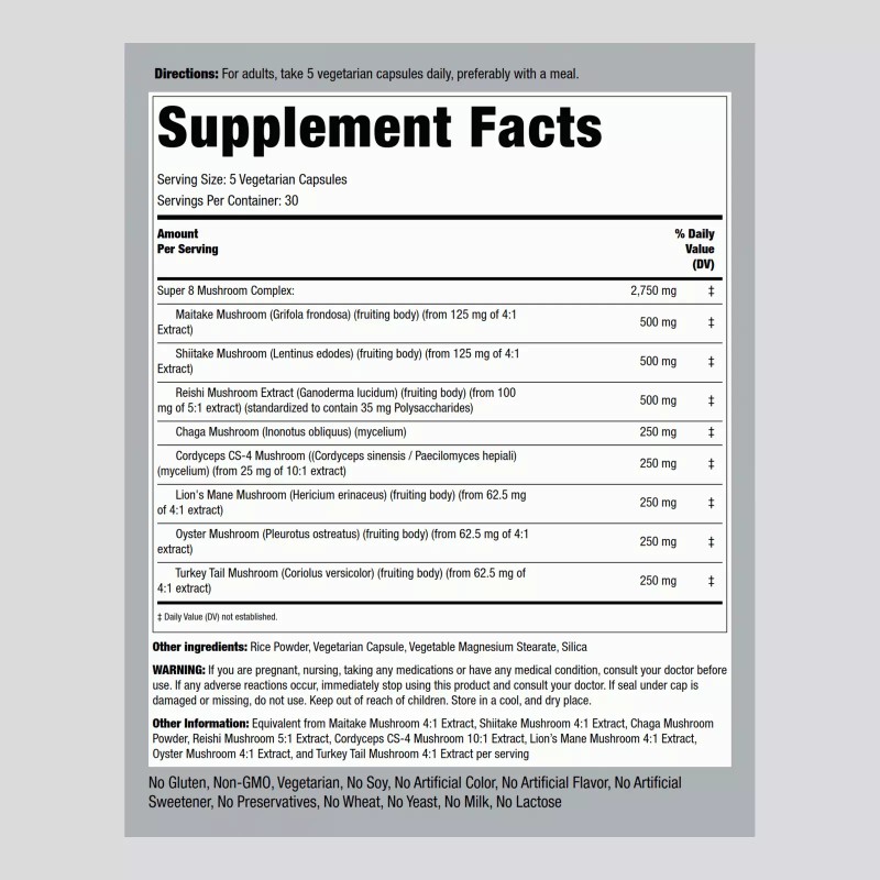 Piping Rock’s 8-Mushroom Extract Complex features an expertly formulated blend of mushroom concentrated and extracts. They are available in vegetarian capsules and are non-GMO, with no gluten, wheat, yeast, milk, lactose, soy, or preservatives.