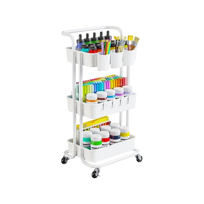 Pipishell 3-Tier Rolling Cart with Wheels - Rolling Storage Cart with Hanging Cups & Hooks - Mobile Utility Cart for Office, Kitchen, Craft Room - Art & Craft Organizer, White, PIUC06W