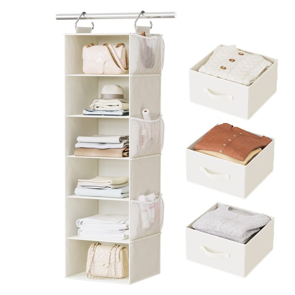Pipishell Hanging Closet Organizer 6-Shelf, Hanging Shelves for Closet with 3 Removable Drawers & Side Pockets, Hanging Shelf Organizer for Bedroom or Garment Rack, 12'' x 12'' x 43.3'', White