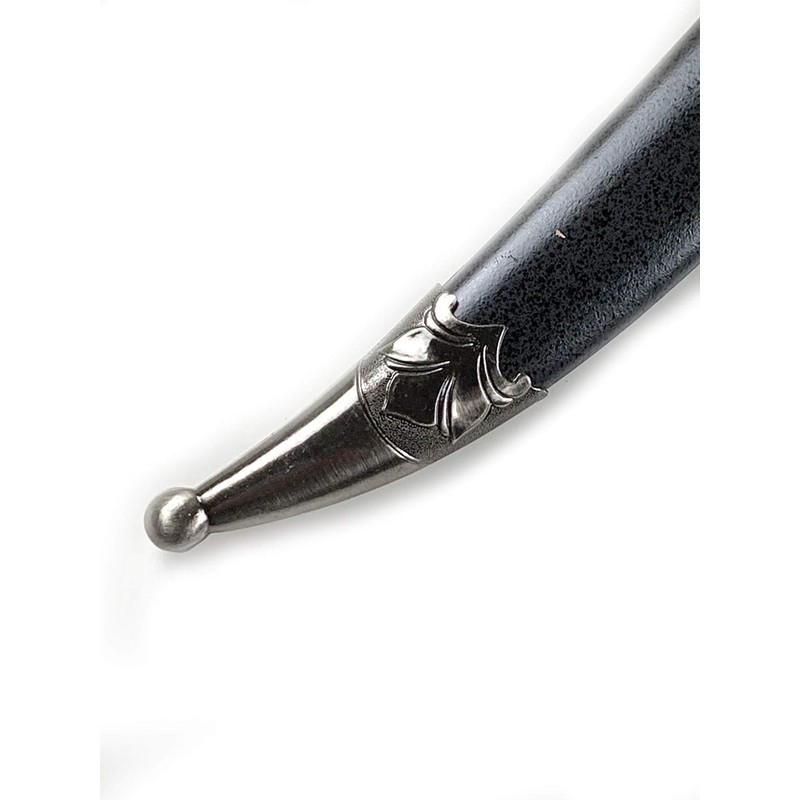 • Scabbard: The scabbard of the sword is wooden with a semi gloss black finish. The drag is a ball point style with an ornate design. A suspension ring has been added to the scabbard throat.