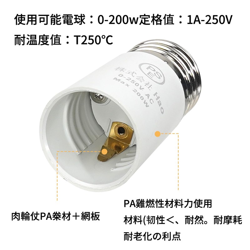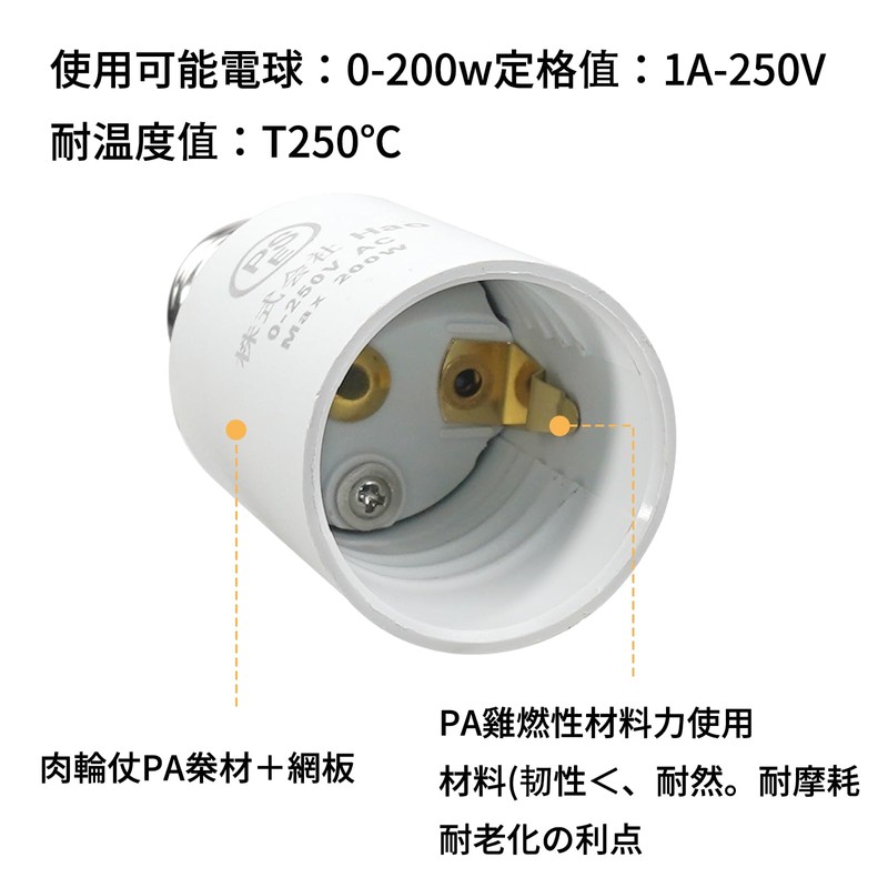 • 1. The housing uses PA flame retardant materials, which have good toughness, heat resistance and abrasion resistance. Inner wheel is made of PA material + copper plate, which can be firmly connected to the lamp socket and bulb