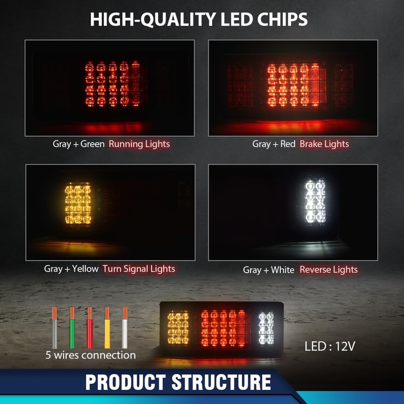 - DOT/SAE certification:Severe bumpy driving will not hinder the normal illumination of the tail lights. Adopting a fully sealed design and equipped with one-way ventilation openings to prevent moisture from being trapped inside.