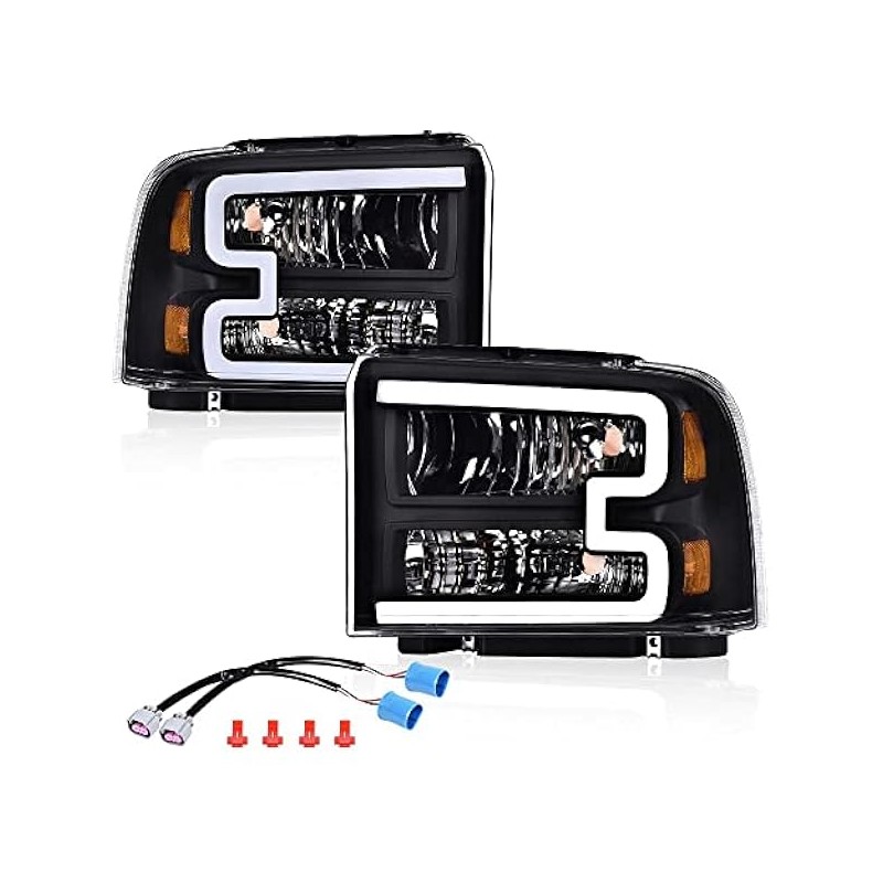 PIT66 LED DRL Headlight Compatible with Ford F250 F350 F450 F550 Super Duty 2005-2007/Compatible with Excursion 2005 6C3Z13008DB,6C3Z13008CB Clear lens Black Housing Amber Reflector