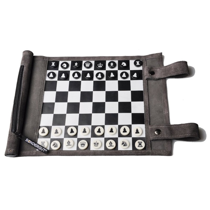 - Designed in Germany by our backpacker friends at Sondergut. Hand sewn pliable leather chess board in gray with all playing pieces.