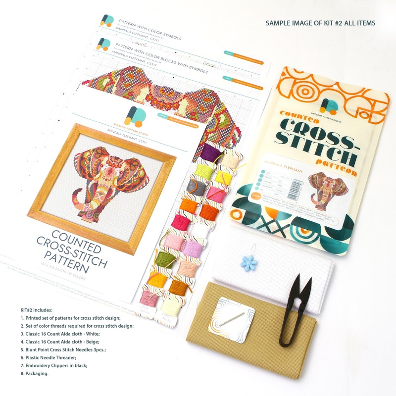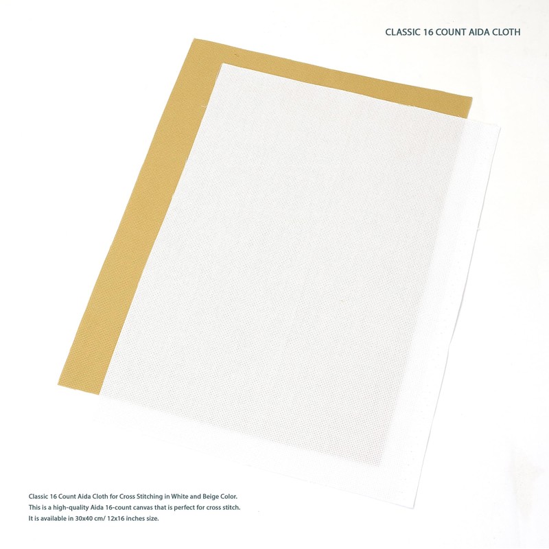 - The KIT contains: 1x 16 Count AIDA fabric in White, 1x 16 Count AIDA fabric in Beige, Set of Threads, 3x Needles, 1x Needle threader, 1x Embroidery clippers in Black, Color counted patterns printed on A3 format paper.