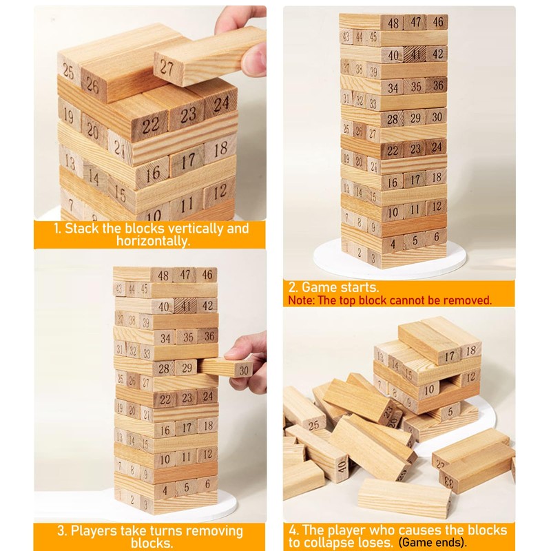 • Fun and exciting game: players take turns taking a block out of the tower and balance it on top. So they build larger and more unstable structures when playing. Developing skills through challenges