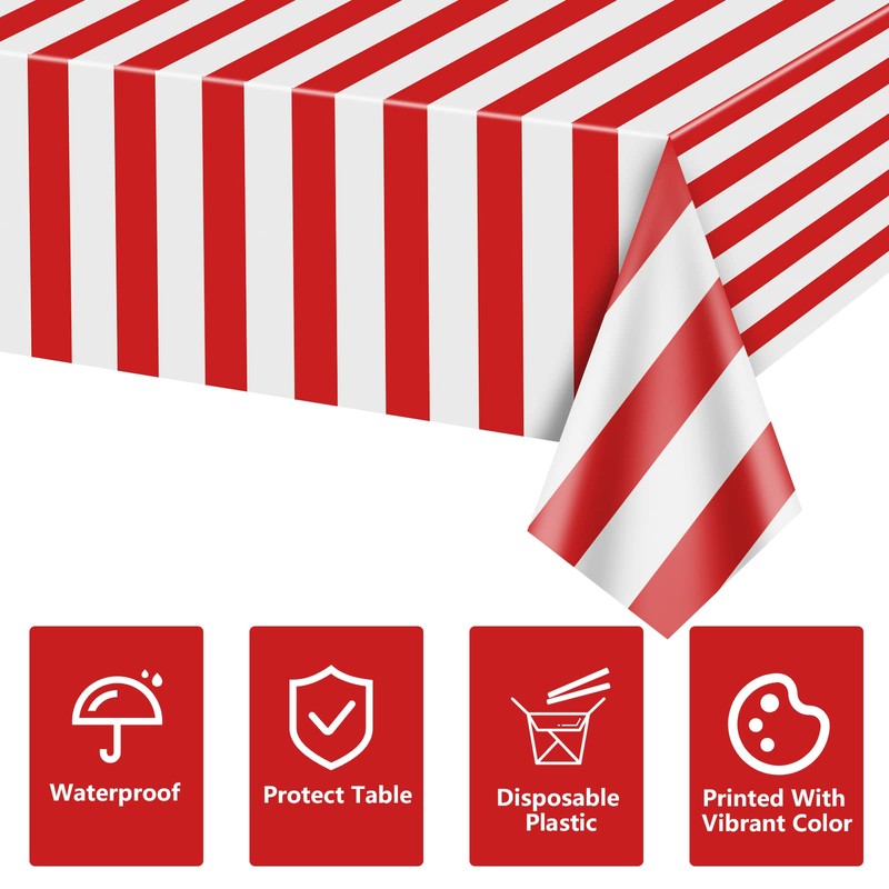 PIXHOTUL 4 Pieces Red and White Stripe Tablecloths, Carnival Theme Party Decorations, 137 x 274cm Plastic Table Cover, for Circus Party, Movie Night, Kid's Birthday, Christmas
