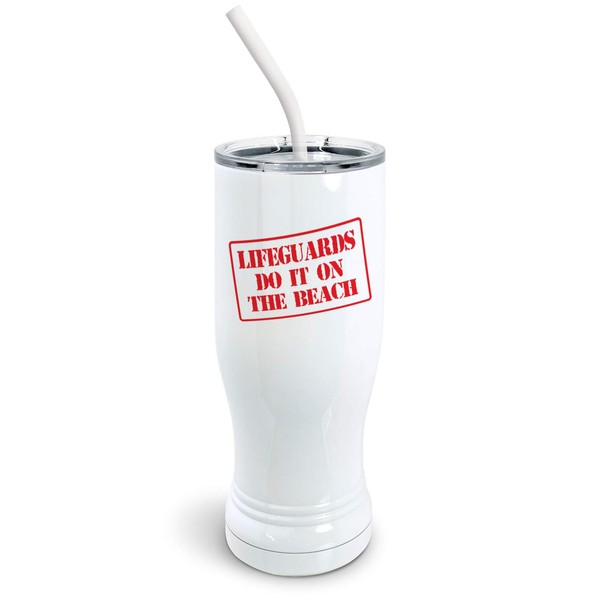 PixiDoodle Lifeguards Do It On The Beach - Funny Life Guard Pilsner Tumbler with Spill-Resistant Slider Lid and Silicone Straw (14 oz Pilsner, White)