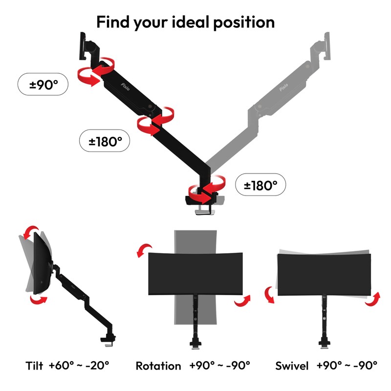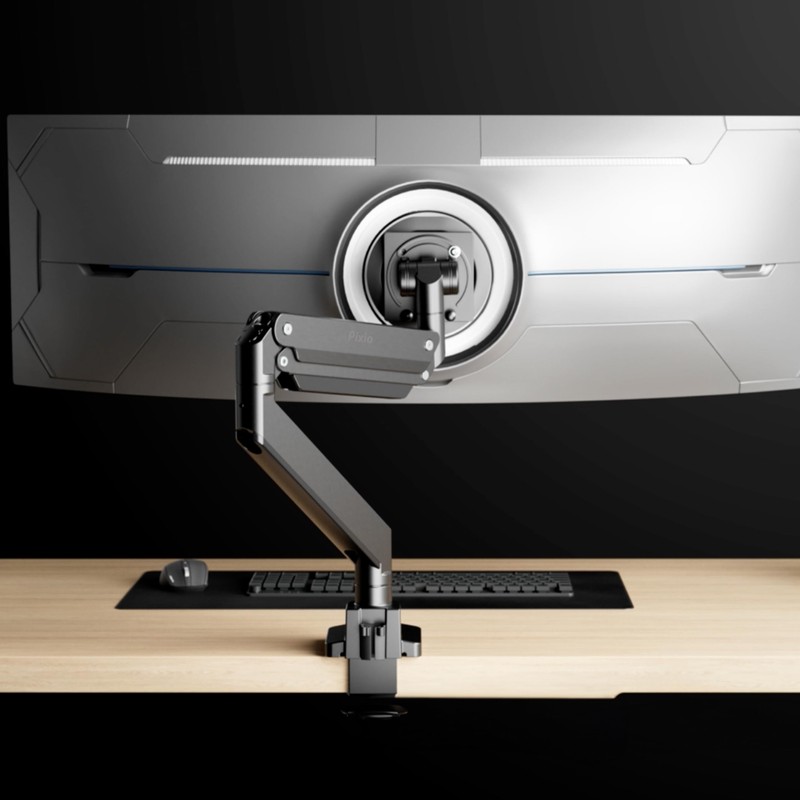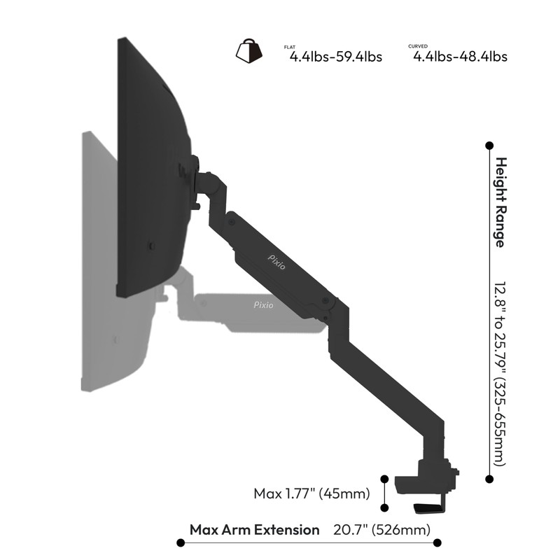 - Upgrade your workspace with the Pixio PS2S Titan Black monitor arm. This heavy-duty stand securely holds ultrawide monitors up to 57 inches and supports up to 59.4 lbs. Enjoy flexible viewing angles with height, tilt, and swivel adjustments. Integrated cable management keeps your desk organized.